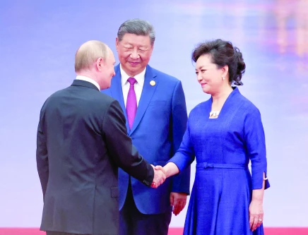 Russia’s President Vladimir Putin, Chinese President Xi Jinping and his wife Peng Liyuan attend a welcoming ceremony of the Shanghai Cooperation Organization (SCO) Summit in Tianjin. Photo: AFP