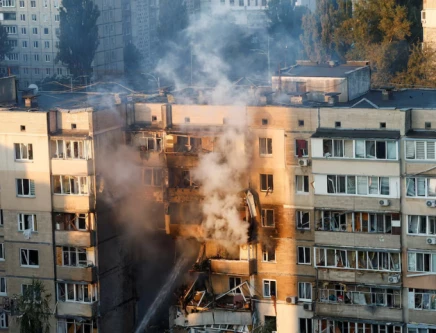 State emergency officials said a fire broke out in two of the four stories of a residential building in the district that hit in the drone attack, with its structure partially destroyed.