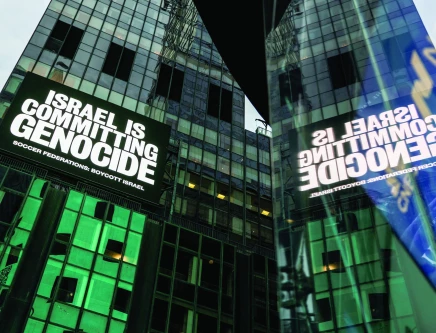 A billboard in Times Square displays the message ‘Israel is committing genocide’ as part of the campaign by Game Over Israel calling for a boycott of Israel by national soccer federations over the war in Gaza, in New York City. Photo: REUTERS