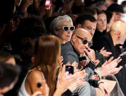 Vogue doyenne Anna Wintour, widely considered an inspiration for the Miranda Priestly character, was also at the show to see the models parade in pyjama-style trousers and shirts, paired with black lace lingerie or oversized jackets.