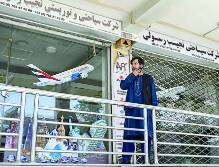 An Afghan employee from a travel agency stands outside his office amid a nationwide telecom outage in Kabul. Photo: AFP