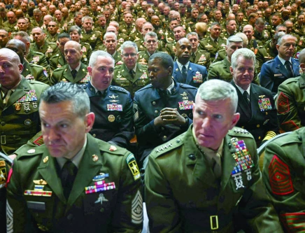 Military members look on before US President Donald Trump addresses senior military officers gathered at Marine Corps Base Quantico in Quantico, Virginia. Photo: AFP
