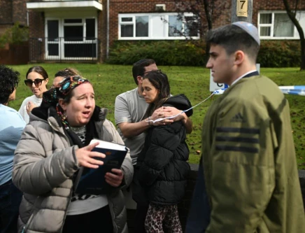 Members of the community comfort each other near Heaton Park Hebrew Congregation Synagogue in Crumpsall, north Manchester, on October 2, 2025, following a "major incident" at the synagogue. PHOTO: AFP
