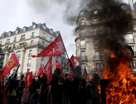 Protesters holding flags walk past a burning garbage bin during a demonstration in Paris as part of a day of nationwide strikes and protests against the government and possible austerity cuts in France, October 2, 2025. Photo: REUTERS