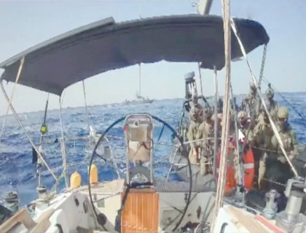 Israeli navy forces approach the vessel the Marinette, believed to be the only ship from the Global Sumud Flotilla still sailing towards Gaza, which flotilla organisers report has now been intercepted. Photo: REUTERS