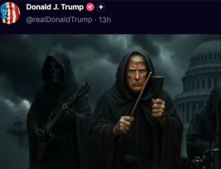 President Donald Trump shared an AI-generated video portraying Office of Management and Budget Director Russ Vought as a “grim reaper,” adding a dramatic visual element to the ongoing debate over government funding.
