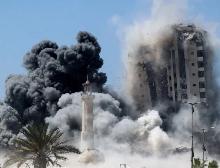 Smoke rises as a building hit by an Israeli air strike collapses, in Gaza City, September 5. PHOTO: REUTERS