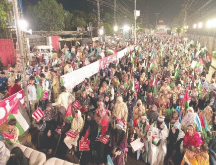 Supporters wave Palestinian and Pakistani flags during the Gaza March organised by Jamaat-e-Islami in Lahore. Photo: NNI