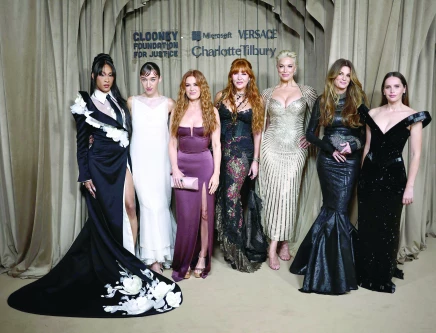 nt: Michaela Ja Rodriguez, Bella Tilbury, Isla Fisher, Charlotte Tilbury, Hannah Waddingham, Jemima Khan and Felicity Jones pose for a photograph at The Albies hosted by the Clooney Foundation. Photo: AFP