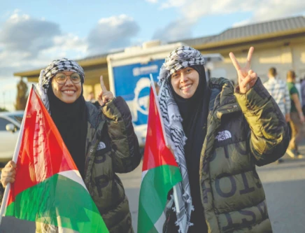 Sisters Nur Heliza Helmi (L) and Nur Hazwani Afiqah binti Helmi, two of the activists who were sailing aboard vessels from the Global Sumud Flotilla, make a victory sign after arriving with thirty-six Turks and nationals from 12 countries at Istanbul Airport. Photo: AFP