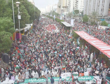 Under the banner of the Jamaat-e-Islami (JI), a massive solidarity march with Gaza drew millions to Shahrah-e-Faisal on Sunday to condemn Israel's continued bombardment of Gaza and to express unity with the people of Palestine and the resistance movement Hamas.