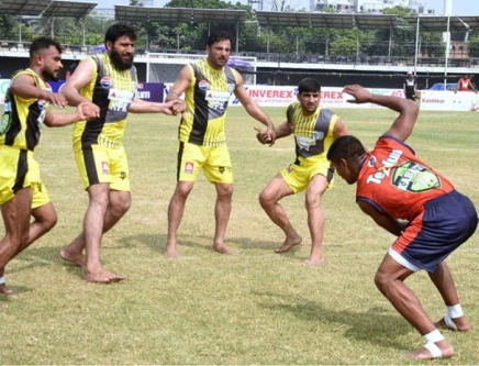 Kabaddi players in action during the match between Khyber Pakhtunkhwa and Sindh teams at Punjab Stadium. PHOTO: APP