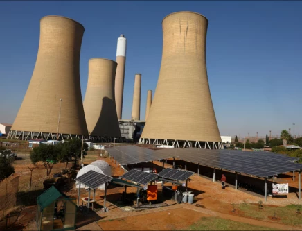 Solar panels are seen near the cooling towers of a retired coal-fired Komati Power Station, operated by Eskom, near Komati village, in the Mpumalanga province in South Africa. Source: Reuters