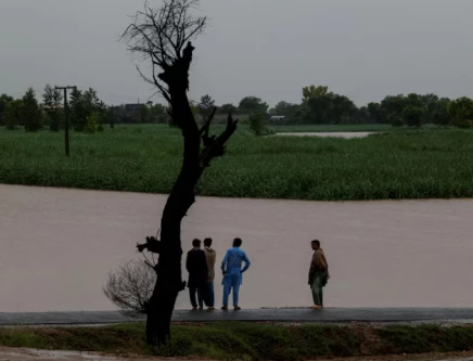 Residents stand on a higher ground with the flooded field in the background, following monsoon rains and rising water levels of the Chenab River, in Patraki village, Chiniot district, Punjab province, Pakistan, August 30, 2025. Photo: Reuters