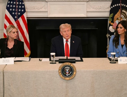 US President Donald Trump, flanked by Attorney General Pam Bondi (L) and Homeland Security Secretary Kristi Noem (R), speaks during a roundtable about Antifa in the State Dining Room of the White House in Washington, DC, on October 8, 2025. Photo: AFP