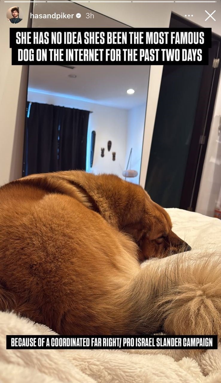 In an Instagram Story, he wrote: “She has no idea she’s the most famous dog on the internet because of a far-right/pro-Israel slander campaign.”