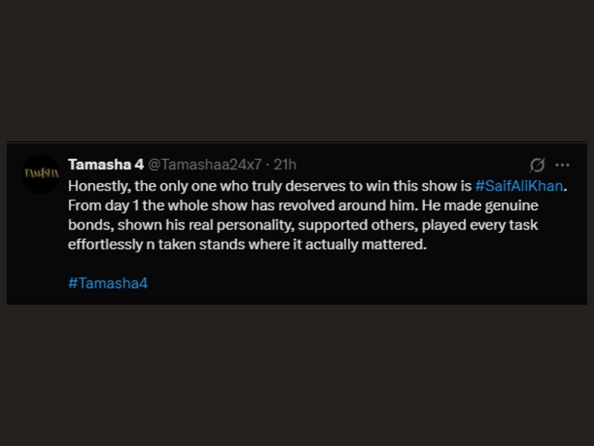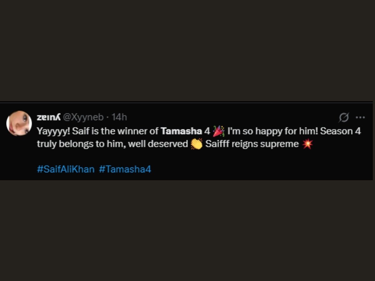 Rumors of an alleged leak about the winner ahead of the finale episode have only fueled the hype online. According to Pakistani blogger Drejaz Waris's Instagram post, fan favourite Saif Ali Khan has won this season of the show. One user online celebrated this alleged win online and wrote, “Yay, Saif is the winner of Tamasha 4. I'm so happy for him. Season 4 truly belongs to him, well deserved. Saif reigns supreme.”