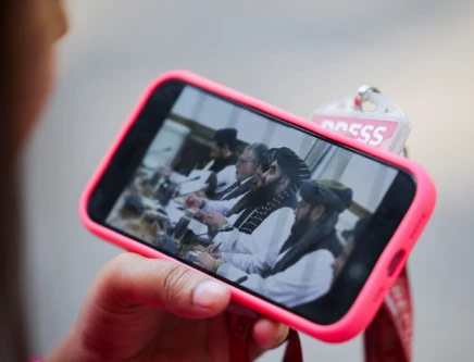 A journalist watches the live streaming of talks between Afghanistan's Foreign Minister Amir Khan Muttaqi and India's Foreign Minister S. Jaishankar, on her phone outside Hyderabad House in New Delhi, India, October 10, 2025. REUTERS