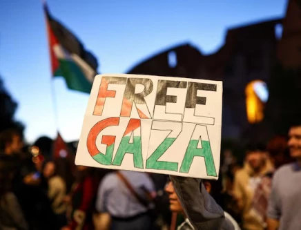 A pro-Palestinian protester holds a banner reading "Free Gaza" in front of the Colosseum during a protest to stand in solidarity with people of Gaza, in Rome. PHOTO: REUTERS