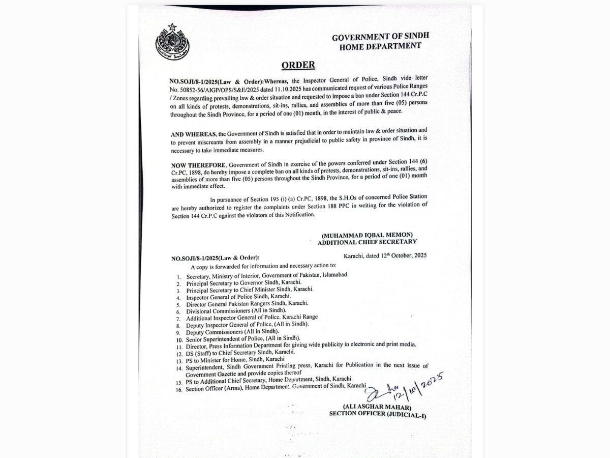 The Sindh government has imposed a one-month ban on protests, demonstrations, sit-ins and rallies across the province. Taking into account the law and order situation, authorities have invoked Section 144, prohibiting gatherings of more than five people.