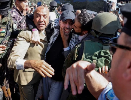A freed Palestinian prisoner is greeted after he was released from an Israeli jail as part of a hostages-prisoners swap and a ceasefire deal in Gaza between Hamas and Israel, in Ramallah, in the Israeli-occupied West Bank, October 13, 2025. PHOTO: REUTERS