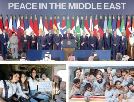 (Clockwise) US President Donald Trump delivers a statement during a summit on Gaza in Sharm el-Sheikh. Freed Palestinian prisoners gesture in Khan Younis. Released Israeli hostage, Matan Zangauker flies in a helicopter with his mother and other loved ones. Photos: Agencies