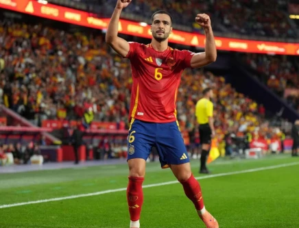 Spain midfielder Mikel Merino celebrates scoring his team's first goal during the 2026 World Cup qualifier against Bulgaria. PHOTO: AFP