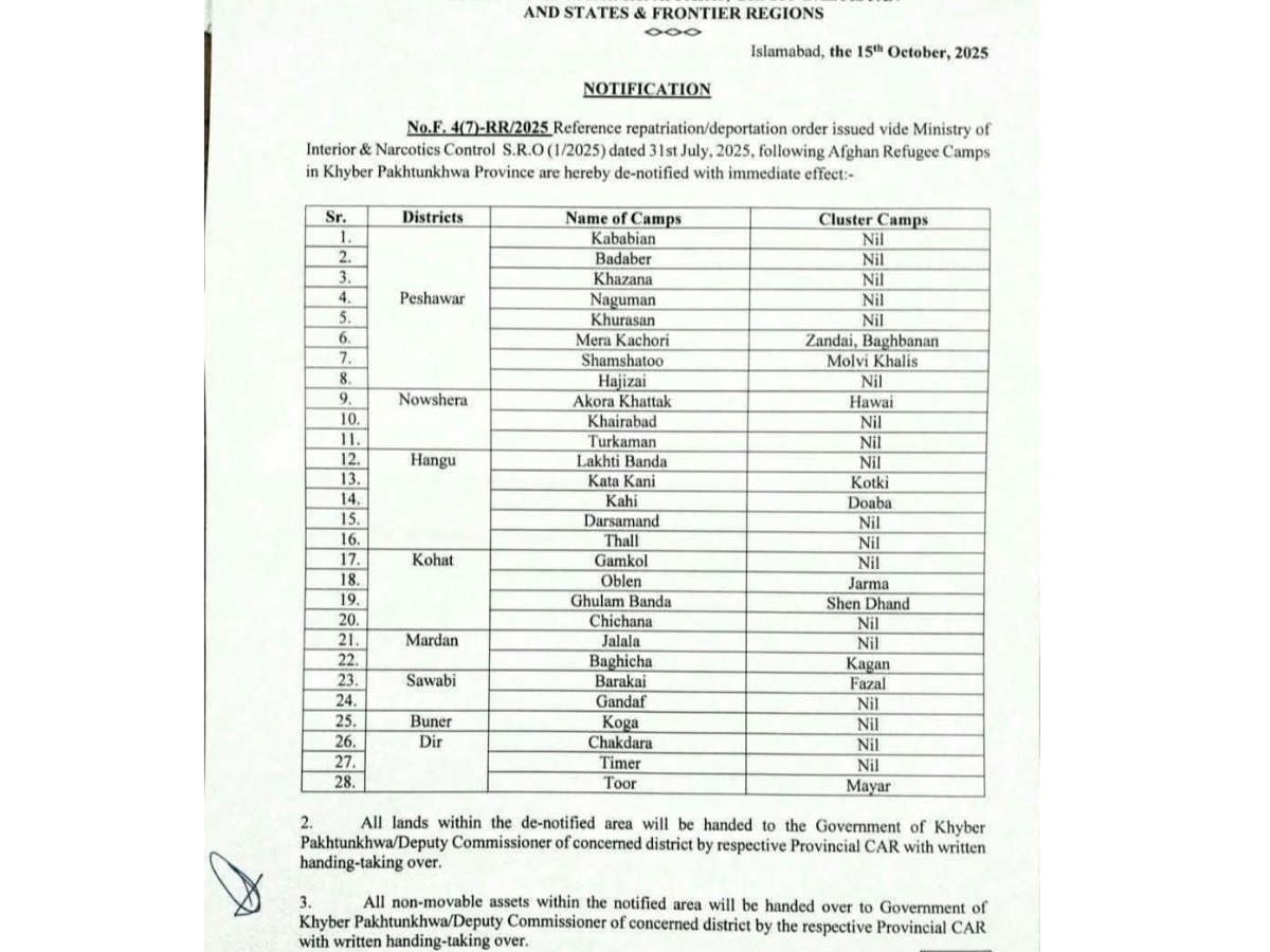 The federal government, on Friday, through the Ministry of Kashmir Affairs and Frontier Regions (SAFRON), issued a formal notification to immediately close 28 Afghan refugee camps across Khyber-Pakhtunkhwa. The notification, dated October 15, 2025, stated that the decision was in line with the Ministry of Interior’s directives of July 31, 2025.