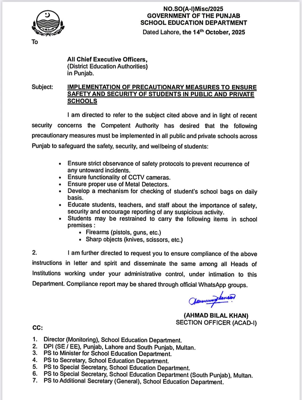 The notification outlined several precautionary steps, including ensuring the proper functioning of CCTV cameras, the use of metal detectors, and checking of students’ bags.
