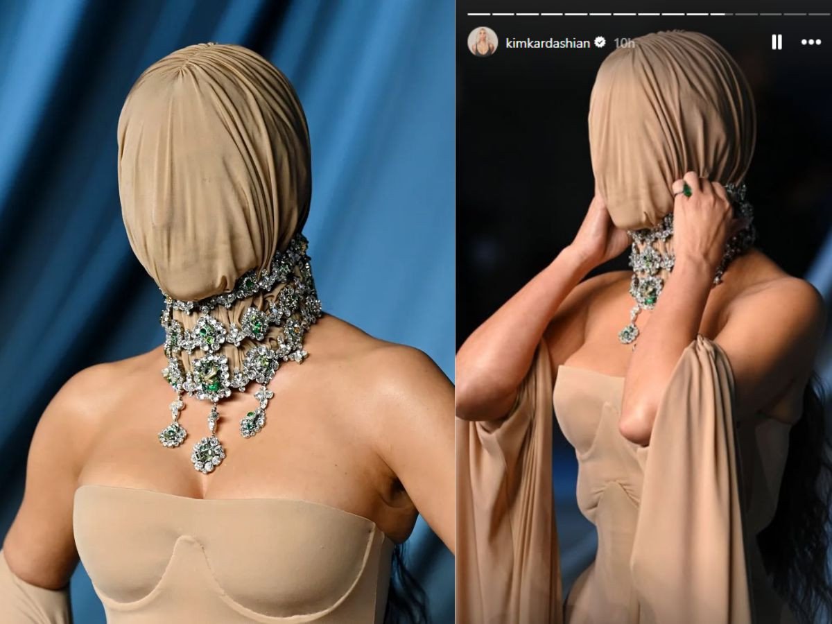 The reality star and entrepreneur arrived wearing a nude-toned Margiela gown that featured sheer cups, a tightly cinched waist, and a sculpted, upturned bodice. The look extended into flowing sleeves and a draped skirt with a train. Completing the avant-garde outfit was a full-face mask that wrapped around her head, held in place by a silver-and-emerald choker necklace with cascading pendants.