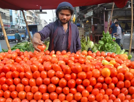 A vendor arranges tomatoes on his pushcart. The kitchen essential was selling on pushcarts for Rs400-450 and in supermarkets at Rs550-580 due to short supply in the market. Photo: Jalal Qureshi/Express