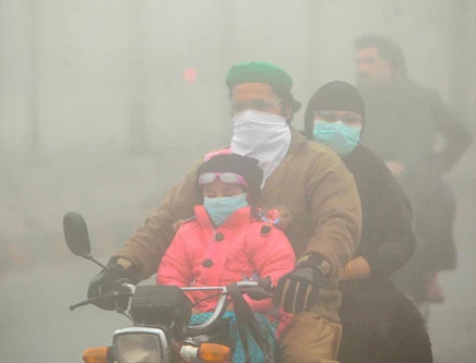 People use face masks to protect themselves from morning smog as they ride on bike along a road in Lahore. Photo: Reuters