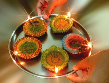 Traditionally, homes are decorated with glowing diyas and colourful rangoli patterns crafted from rice flour, and flowers. People wore new clothes, exchanged sweets and gifts with friends and relatives, worshiped their gods, and celebrated the festival with fireworks.