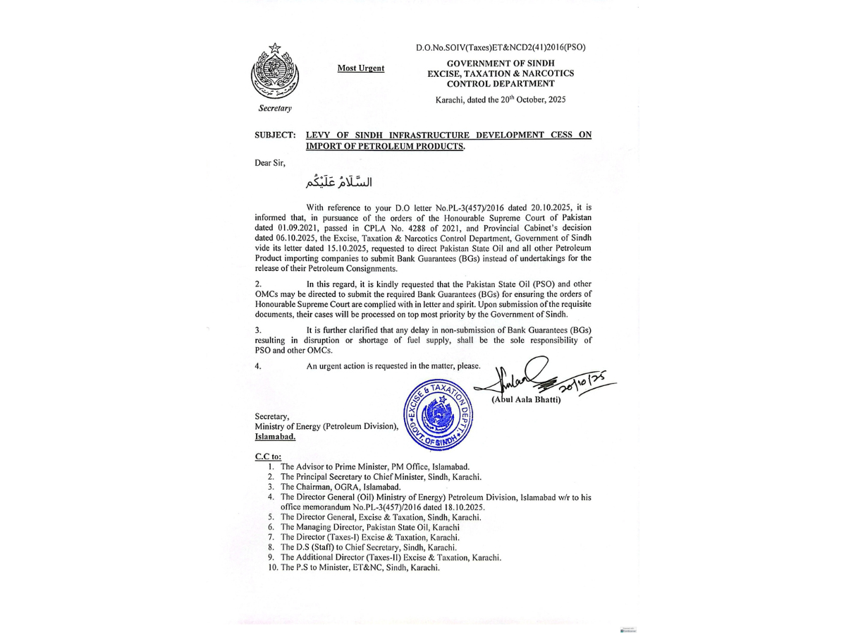 The Sindh Excise Department has issued a second urgent notice to OMCs, directing them to submit the required bank guarantees instead of undertakings. The department has stated that companies’ cases will only be processed once the guarantees have been received.