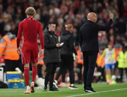 Liverpool's Hugo Ekitike walks past manager Arne Slot after being sent off. PHOTO: REUTERS