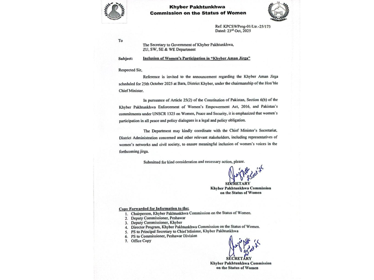 The Khyber-Pakhtunkwa Comission on the status of Women have issued a notification asking the K-P government to ensure the inclusion of women's voices in the forthcoming jirga.