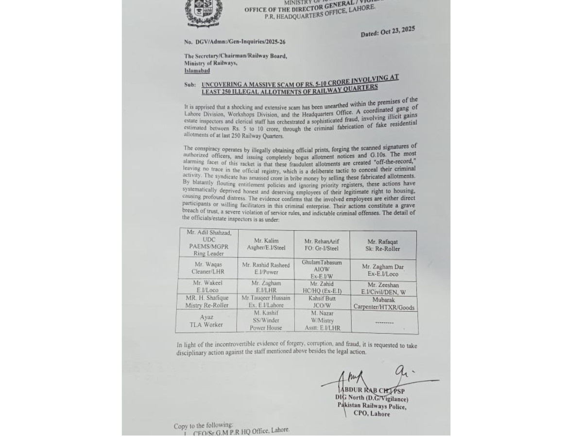 DG Abdul Rab Chaudhry had uncovered the fraud at Lahore Division, Mughalpura Workshop, and the Railway Headquarters. His report revealed the involvement of 19 railway employees in the scheme.