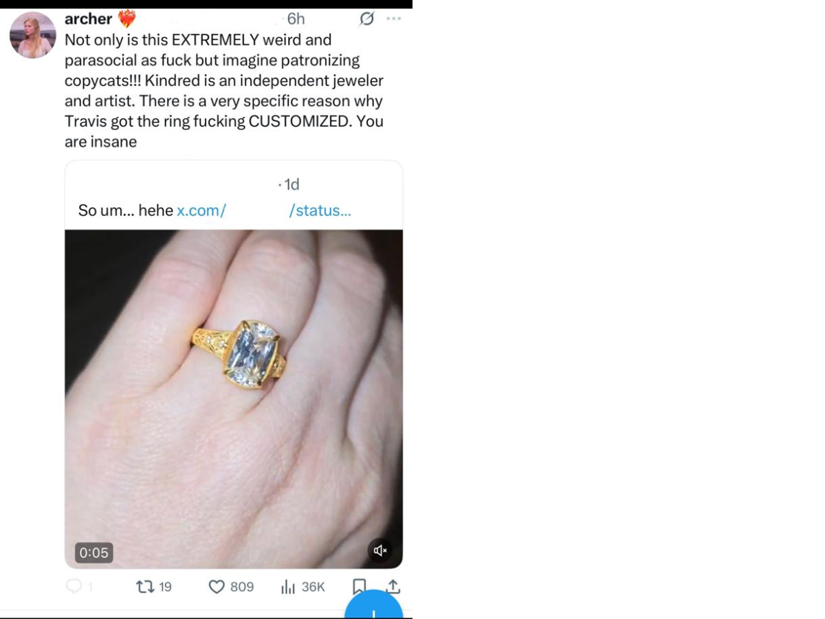 A fan’s Instagram and X post showcasing a replica of the engagement ring worn by Taylor Swift and Travis Kelce has ignited criticism from parts of the singer’s fanbase.