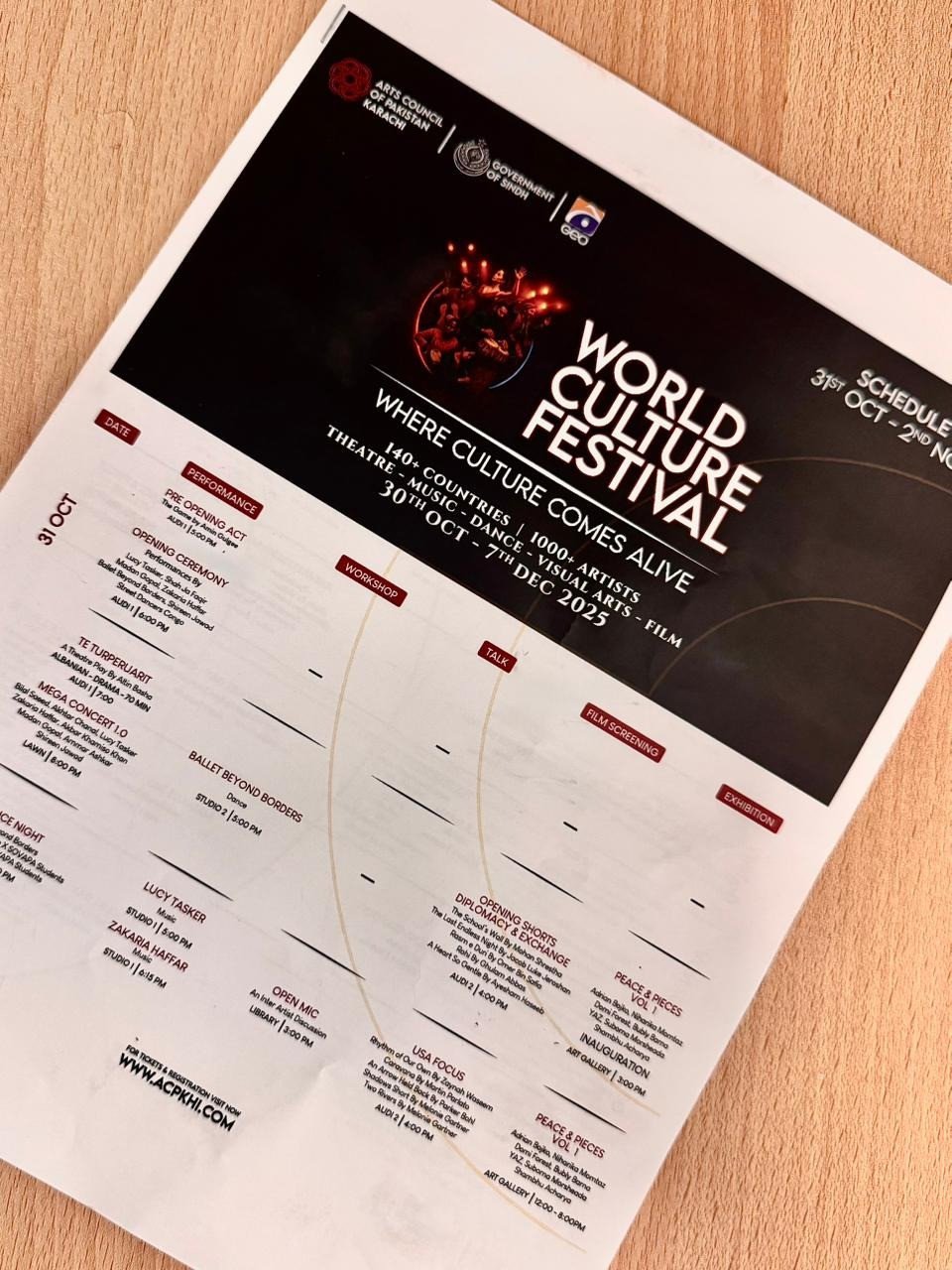 The Arts Council of Pakistan Karachi, in collaboration with the Government of Sindh, will officially host the World Culture Festival from October 31 to December 7, offering a 38-day celebration of art, music, theatre, and dance from around the globe.