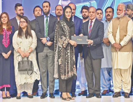 Prime Minister Shehbaz Sharif awards a laptop to a student in Islamabad. Photo: Online