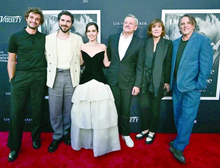 French actors Aubry Dullin and Guillaume Marbeck, US actress Zoey Deutch, Netflix co-CEO Ted Sarandos, French producer Michèle Halberstadt, and US filmmaker Richard Linklater attend the premiere of Netflix’s ‘Nouvelle Vague’ during The American French Film Festival (TAFFF) at the Directors Guild of America (DGA) Theater in Los Angeles. Photo: AFP