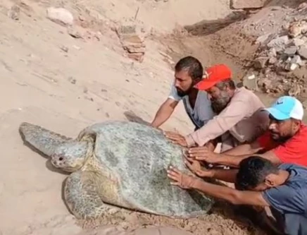 The incident occurred at Hawksbay, where the construction of beach huts has endangered the last remaining nesting grounds for female turtles in Pakistan. Officials helped the heavy green turtle cross the sand mound to reach a suitable nesting site.