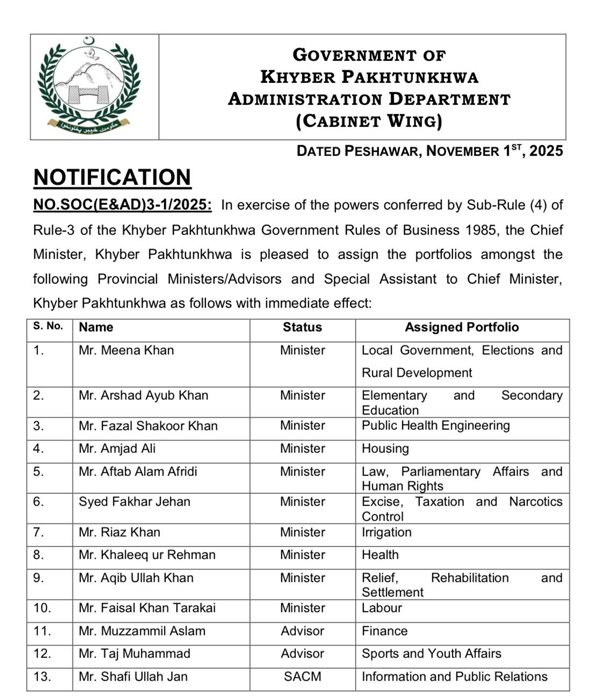 Dr Amjad Ali will continue to oversee the Housing portfolio, a position he held under previous provincial administrations. Aftab Alam Afridi has been reinstated as Minister for Law, Parliamentary Affairs and Human Rights, while Syed Fakhar Jehan will now lead the Excise and Taxation Department, having earlier served as Minister for Sports and Youth Affairs.