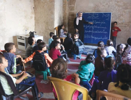 In the school's courtyard, young girls lined up for the morning assembly, performing stretching exercises under their teachers' supervision and chanting: "Long live Palestine!" As classes began, about 50 girls crammed into a single classroom, sitting on the floor with no desks or chairs.