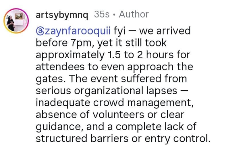 One user recounted the experience, "We arrived before 7pm, yet it still took 1.5 to 2 hours for attendees to even approach the gate. The event suffered from serious organizational lapses - inadequate crowd management, absence of volunteers or clear guidance, and a complete lack of structure barriers or entry control."