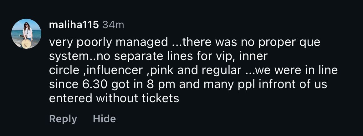 Another agreed, "Very poorly managed, there was no proper queue system, no separate lines for VIPs, influencers, pink and regular attendees. We were in line since 6.30 PM and got in at 8. Many people in front of us entered without tickets."