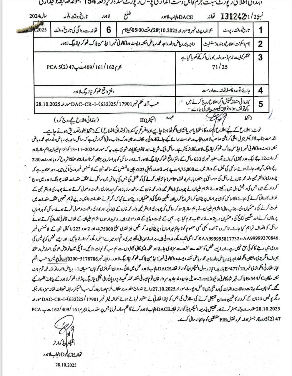 The FIR and inquiry report further stated that Warraich, in alleged collusion with private individuals including Chaudhry Zulqarnain, misused his authority to harass the complainant and threatened false criminal cases when he refused to meet additional illegal demands.