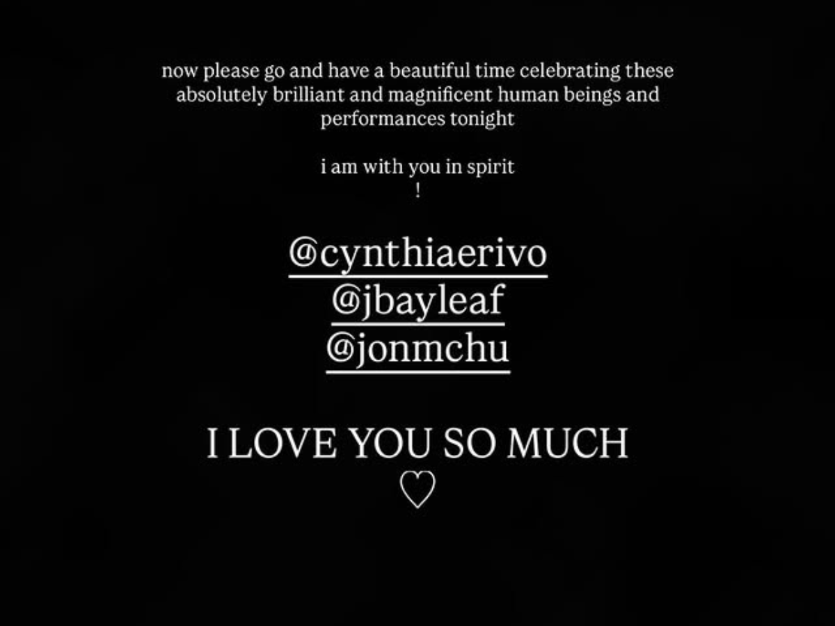 The Grammy-winning star also urged fans to “shower my incredible castmates with all the love I wish I could be showering you with.”