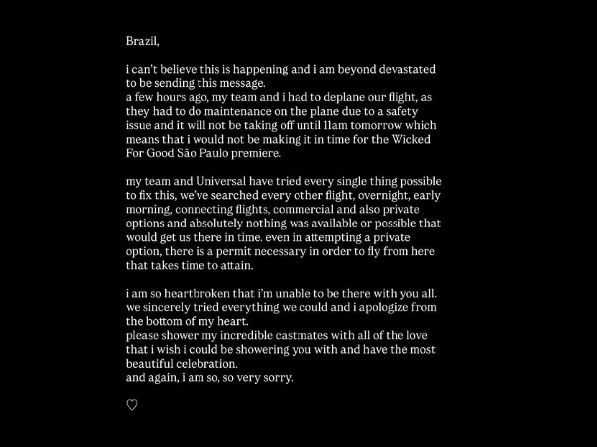 “I can’t believe this is happening and I am beyond devastated to be sending this message,” Grande wrote, explaining that her team had to deplane when their aircraft required urgent maintenance. “It will not be taking off until 11 a.m. tomorrow, which means I would not make it in time for the Wicked: For Good São Paulo premiere.”