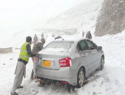 Workers push a stranded car along a snow-covered road in Abbottabad after the region received its first snowfall of the season. Photo: PPI